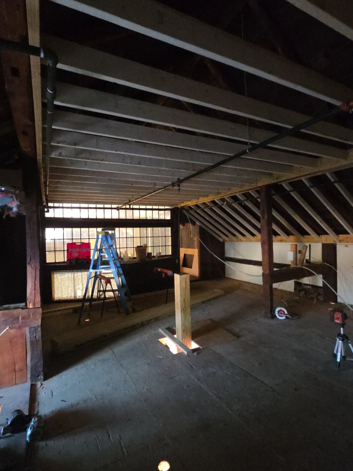 1/13/26 - Construction is well under way in our new second home in Simsbury CT at the Simsbury Town Shops. In the main retail space, the crew has reinforced and framed the ceiling and braced the building to raise the ceiling. This will give us height in the front of the store to hang all the beautiful quilts we have to display.