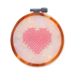 Celebrate your love for crafting with the Cross Stitch Embroidery Hoop French Barrette. Featuring a gently curved round embroidery hoop shape, this clip showcases a pearly white background with a playful embossed pink heart cross stitch design. Perfect for makers, it fastens securely with a classic French barrette clasp, adding a delightful touch to any hairstyle.