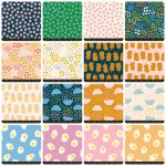 In 2017, Kim introduced her Fried Egg print as part of a chicken-themed collection called Welsummer. It took on a life of its own, being featured in Ruby Star Society’s Darlings collection. It has become a favorite amongst Kim’s food-themed prints, and for this season’s collection she thought it needed the spotlight. So, following in the footsteps of Strawberry & Friends, Kim brought together some breakfast All-Stars, including cereal, honey bears, and fruit. For the cereal box print, Part of This Complete Breakfast, Kim channeled 70s Wacky Packages stickers and Saturday morning cartoon energy into silly, cute imaginary brands. And remember the popular gummy bears from Kim’s Sugar Cone collection? Meet their sweet ursine cousins, the Honey Bears. And, of course, the Fried Eggs print is back in three new colorways. The collection is rounded out by a versatile tablecloth-inspired gingham, smiley faces, and a blender called Sugar Rush, invoking the crackle and pop of cereal packaging.